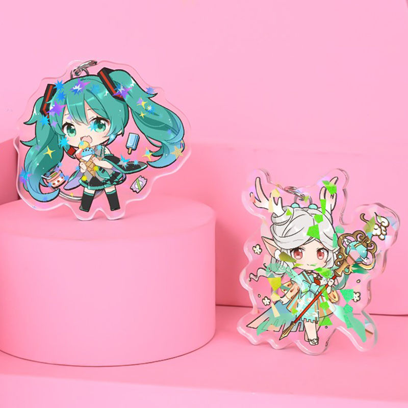 Custom clear acrylic keychains are durable, odorless, water resistant and light in weight. The acrylic charms are bright in color and pattern and will not fall off. The edges are smooth and see-through. Additional processes, such as epoxy, holographic, can be selected.